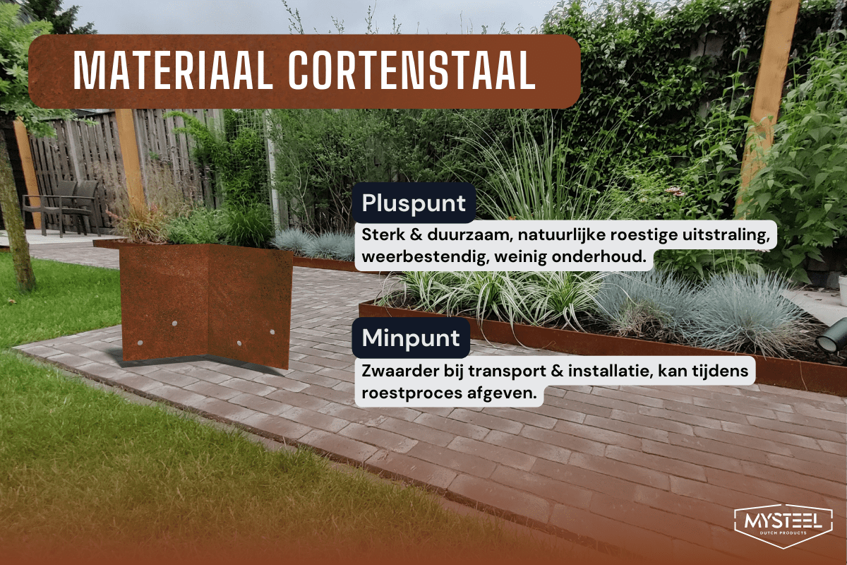 Teras ja cortenteras on tugevad ja kestavad kaua, kuid rooste välimus ja hoolduse nõudlus erinevad. Plastik on kerge ja paindlik, samal ajal kui puu näeb loomulik välja, kuid on mädanikku vastuvõtlik. Kivi on vastupidav, kuid cortenteras pakub tänapäevast välimust ja suuremat paindlikkust.