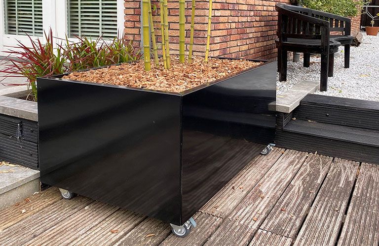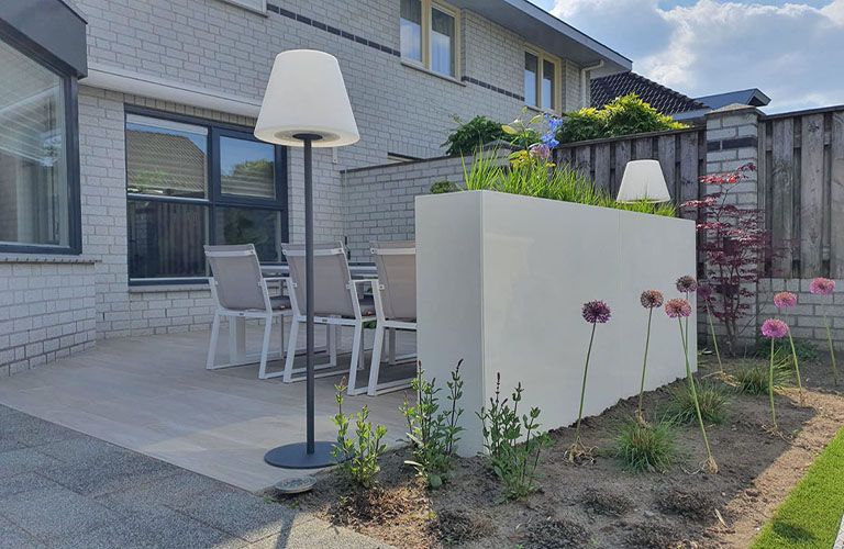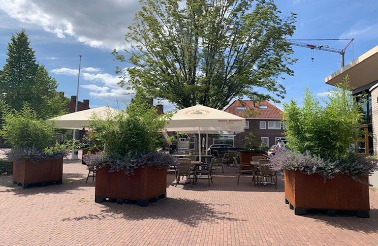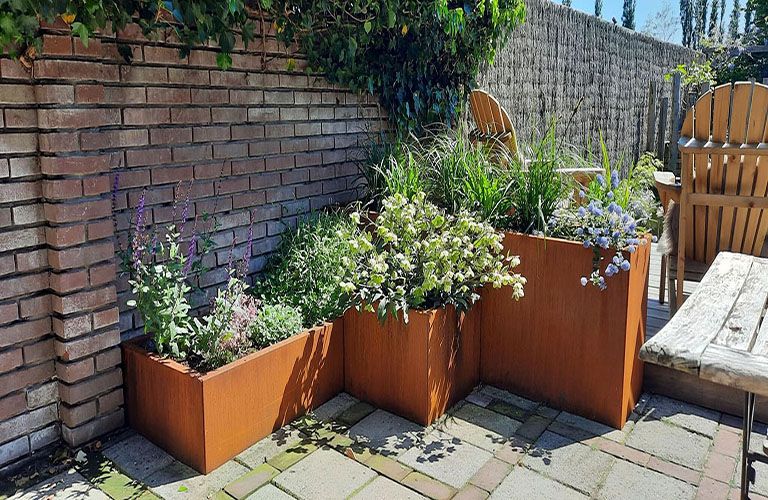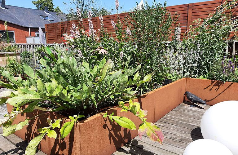 Meie klient lõi rohkem privaatsust, paigaldades Corten terasest kõrged potid terrassi küljele. Ideaalne, kui soovite õhtul terrassil jooke nautida, kuid soovite siiski kaitsta end naabrite uudishimulike pilkude eest. Corten terasest potid, mis on kombinatsioon kõrgete ürtide või bambusega, moodustavad alati rohelise aia varikatte ja toovad päikeselise tunde. Corten terasest pott eraldusena aia ripub 1200x300x600 mm (pikkus x laius x kõrgus). See pott võtab põrandal vähe ruumi, kuid tagab maksimaalse mõju.