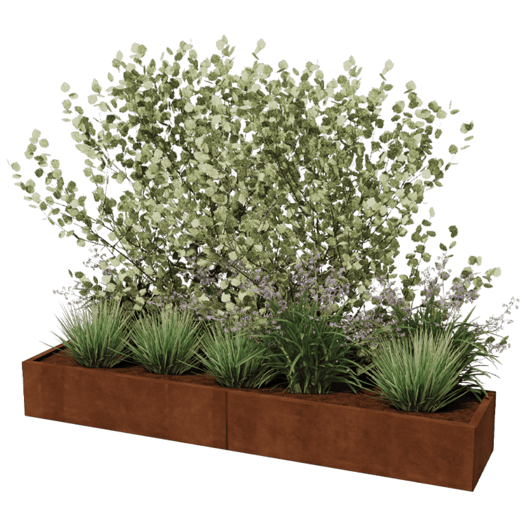 Ülemine serv on kahekordne. See annab taimekastile ajatu ja julge välimuse. Roostes värv annab sooja ilme ja muudab need taimekastid sobivaks nii modernsetesse kui ka klassikalistesse aedadesse. Materjali paksus sõltub kõrgusest. Taimekastid, mille kõrgus on kuni 60 cm, on 1,5 mm paksused. Alates 80 cm kõrgusest on materjal 2 mm paks. On põhjalikult testitud, et need paksused on taimekastide jaoks piisavad.