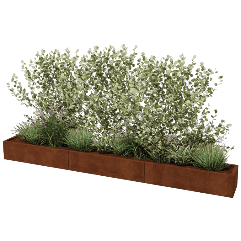 Meie modulaarsete taimekastide paneelid on valmistatud kvaliteetsest Corten-A terasplekist. Selle metalliliigi ainulaadne omadus on see, et see moodustab väga tiheda oksüdeerunud pinna (roostekihi) . Seetõttu on roostetamine võimatu. Tihe oksüdeerunud pind kaitseb sügavamal asuvat materjali hapniku eest, mistõttu oksüdeerumine aeglustub, samas kui korrosioon jätkub. Corten terasest taimekast tarnitakse roostetamata, halli metallivärviga. Roostetamisprotsess algab pärast nädalate kuni 2 kuu möödumist, selleks ei ole vajalik mingit töötlemist. Roostetamisprotsessi ajal võib taimekast jätta jälgi. Corten teras on metallisegu, mis koosneb raud, millele on lisatud vaske, fosforit, räni, niklit ja kroomi.